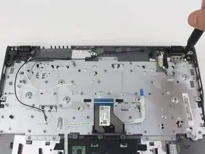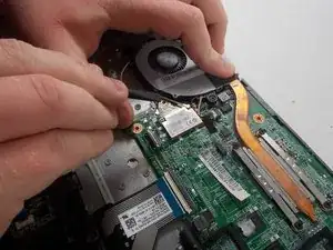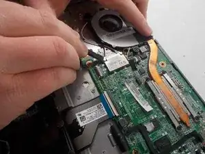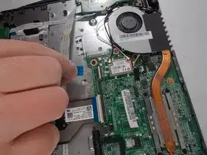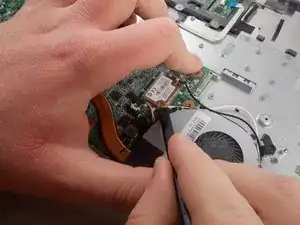 Place the back of the spudger under the black wire that connects the wireless card to the motherboard.
