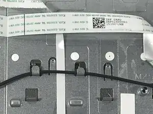 Use the plastic pry tool to unlatch the two tabs on either side of the black ribbon.
