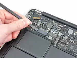 Use the flat end of a spudger to pry both short sides of the battery connector upward to disconnect it from its socket on the logic board.