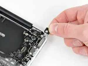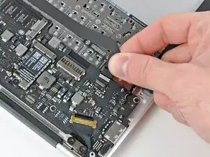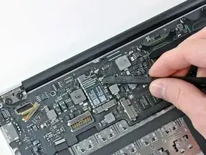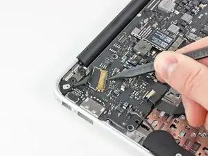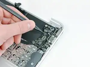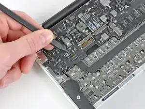 Use the flat end of a spudger to pry both short sides of the battery connector upward to disconnect it from its socket on the logic board.