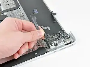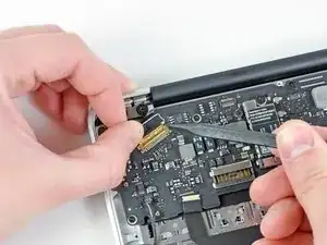 Use the tip of a spudger or your fingernail to flip up the retaining flap on the trackpad ribbon cable ZIF socket.