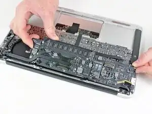 Gently lift the logic board assembly out of the upper case, minding the fragile heat sink and any cables that may get caught.