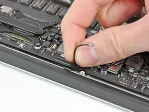 Remove the small rubber gasket from the corner of the upper case near the display data cable.