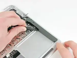 Use the flat end of a spudger to pry the left speaker off the adhesive securing it to the upper case.
