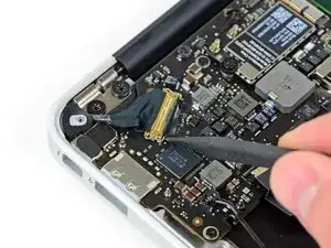 Use the tip of a spudger or your fingernail to flip up the retaining flap on the trackpad ribbon cable ZIF socket.