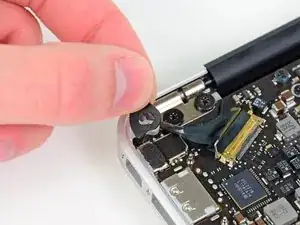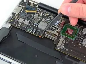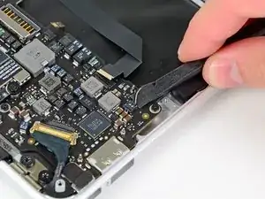 Use the flat end of a spudger to pry the right speaker cable connector up and out of its socket on the logic board.