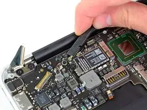 Use the flat end of a spudger to pry both antenna cable connectors up and off their sockets on the AirPort/Bluetooth card.