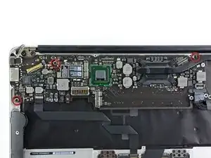 Gently lift the logic board assembly out of the upper case, minding the fragile heat sink and any cables that may get caught.