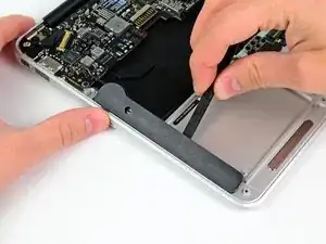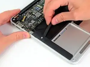Use the flat end of a spudger to pry both short sides of the battery connector upward to disconnect it from its socket on the logic board.