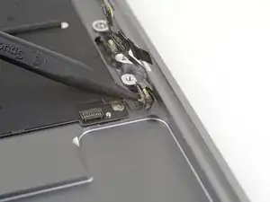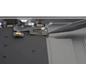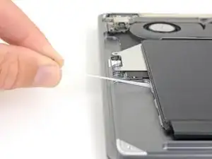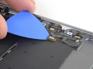 Slide the tip of a spudger underneath the left speaker cable and pry straight up to disconnect the speaker.
