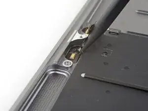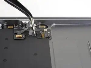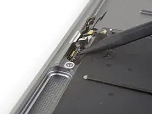 Use a pair of tweezers to lift up the black adhesive pull tab at the bottom of the left speaker, enough so you can grab it with your fingers.