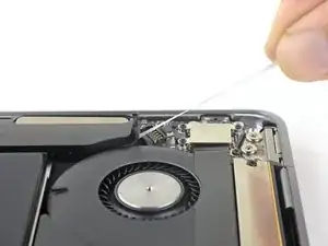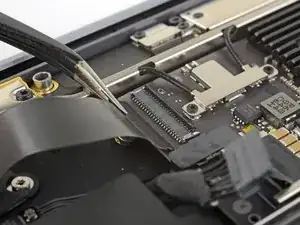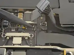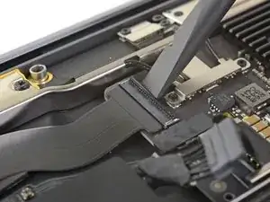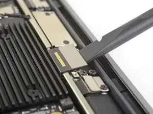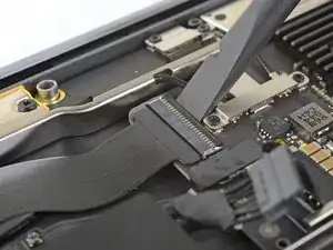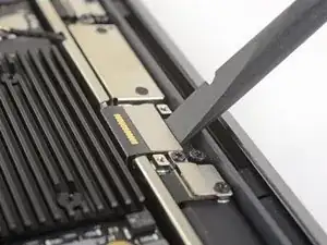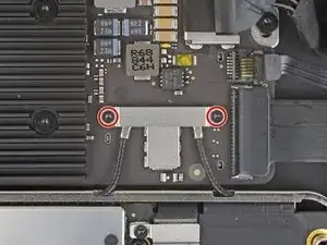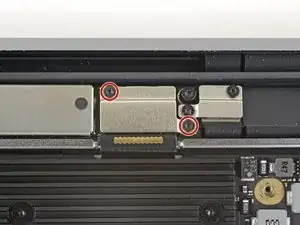Use a T3 Torx driver to remove the two 1.5 mm screws securing the display cable connector bracket.