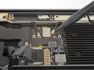 Insert the point of a spudger under one of the antenna cables close to the connector. Pry straight up to disconnect the cable.
