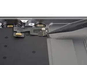 Use the point of a spudger to carefully pry one of the microphones out of its recess in the upper case.