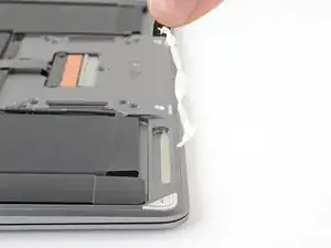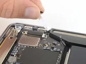 With the connector disconnected, slide the flat end of a spudger under the cable to separate the adhesive securing the cable to the logic board.