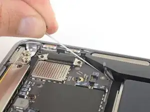 Use a T3 Torx driver to remove the two 1.4 mm screws securing the antenna cable bracket.