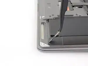 Use tweezers to lift the adhesive pull tab at the top of the left speaker enough that you can grab it with your fingers.