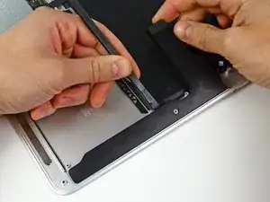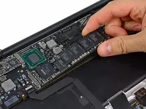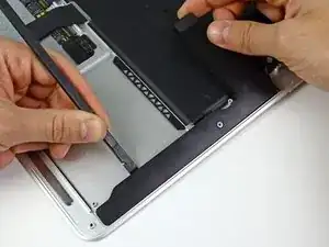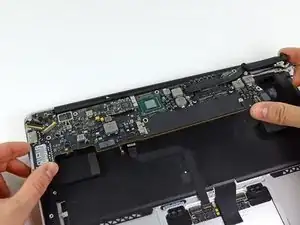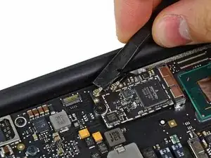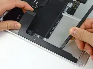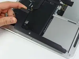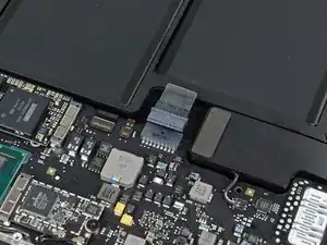 Grab the clear plastic pull tab attached to the battery connector and pull it toward the front edge of the Air to disconnect the battery from the logic board.