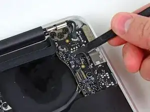 Pull the camera cable parallel to the face of the I/O board toward the corner of the Air to disconnect it from its socket, using the tip of a spudger to help push the connector out of its socket.