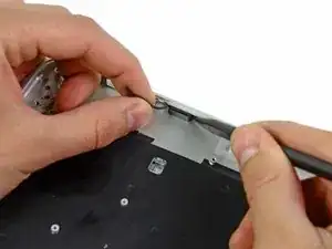 Use the flat end of a spudger to pry the left speaker off the adhesive securing it to the upper case.