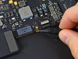 Gently push the tip of a spudger under the black plastic flap stuck to the display data cable lock to make the lock pop upward and away from the socket.