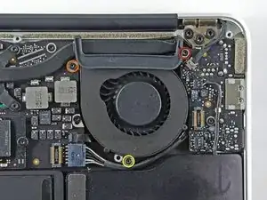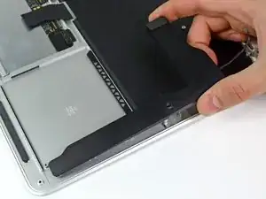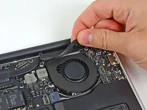 Lift the fan out of the upper case and carefully pull the fan ribbon cable out of its socket as you remove it from the Air.