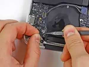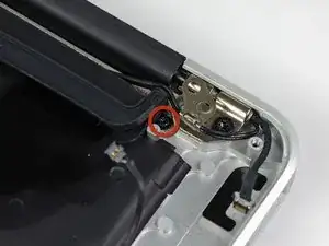 Remove the inner two 4.9 mm T8 Torx screws securing the right display hinge to the upper case.