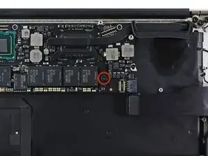 Push the antenna cable retainer away slightly and remove the 3 mm T5 Torx screw securing the end of the heat sink to the upper case.