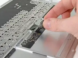 While carefully lifting the keyboard ribbon cable with one hand, use the tip of a spudger or your fingernail to flip up the retaining flap on the keyboard ribbon cable ZIF socket.