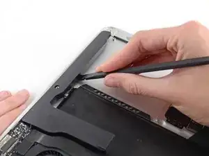 Use the flat end of a spudger to pry the left speaker off the adhesive securing it to the upper case.