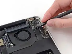 Use the flat end of a spudger to pry the left speaker cable connector up and out of its socket on the I/O board.