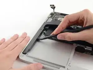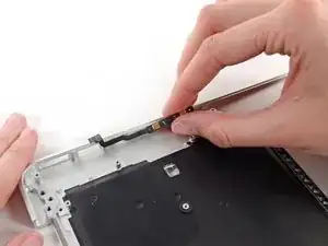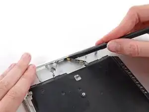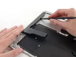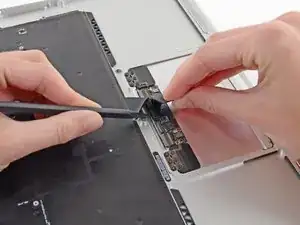 Slide the flat end of a spudger under the right speaker from the end nearest the hinge to the front edge of the Air to loosen the adhesive.