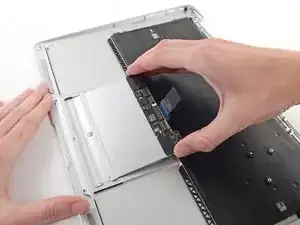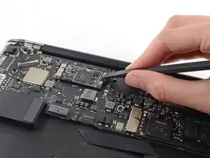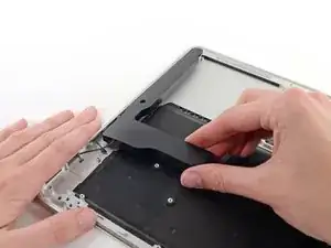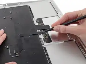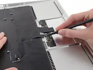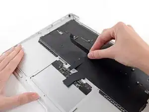 While carefully lifting the keyboard ribbon cable with one hand, use the tip of a spudger or your fingernail to flip up the retaining flap on the keyboard ribbon cable ZIF socket.