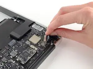 Pull the camera cable parallel to the face of the I/O board toward the front edge of the Air to disconnect it from its socket.