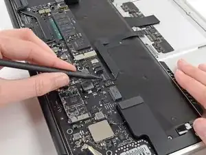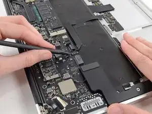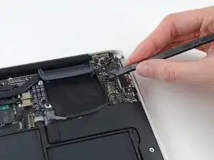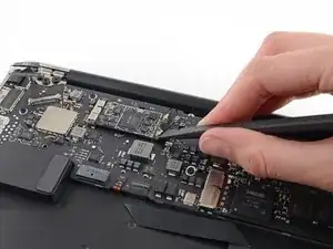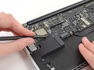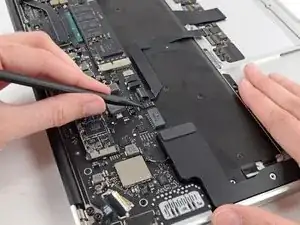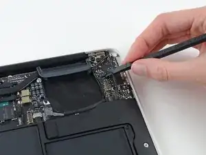 Use the flat end of a spudger to pry the right speaker cable connector up and out of its socket on the logic board.