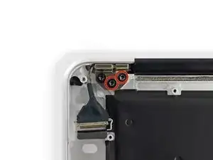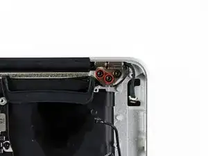 Remove the inner two 4.9 mm T8 Torx screws securing the right display hinge to the upper case.