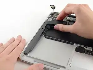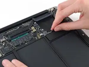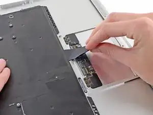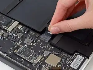 Grab the clear plastic pull tab attached to the battery connector and pull it parallel to the board toward the front edge of the Air.