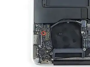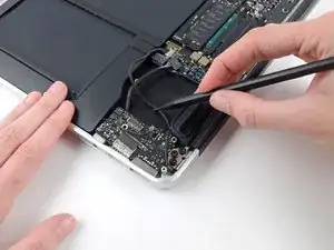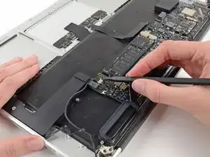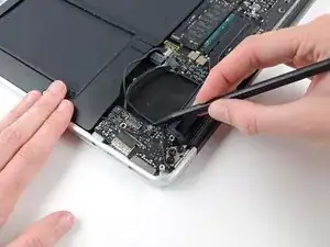 Use the tip of a spudger to carefully flip up the retaining flap on the fan cable ZIF socket.