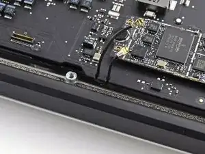 Push the antenna cable retainer away slightly and remove the 3 mm T5 Torx screw securing the end of the heat sink to the upper case.