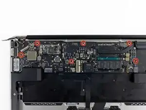 Carefully remove the logic board assembly from the upper case, minding any cables that may get caught.