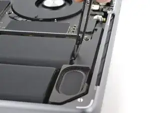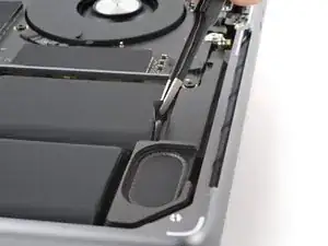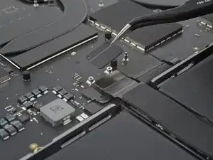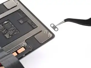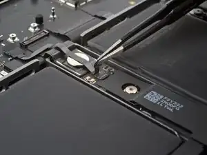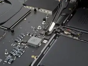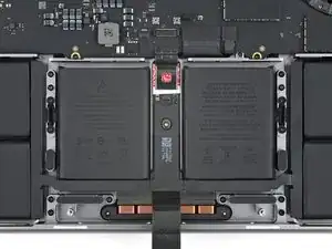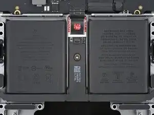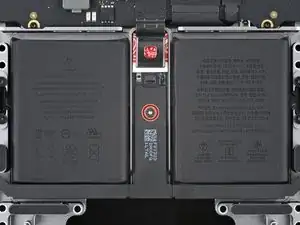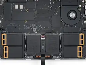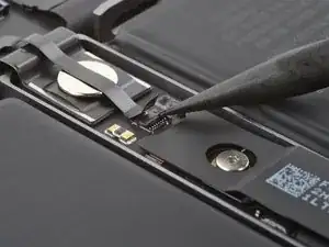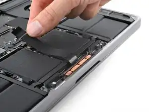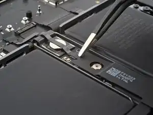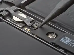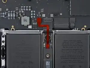 The battery data cable is adhered to the battery board and logic board. In the next few steps, you'll disconnect it, separate its adhesive, and remove it.