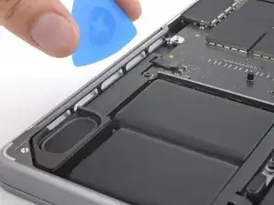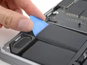 Insert the flat end of an opening pick between the stuck battery cell and the speaker.