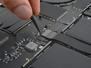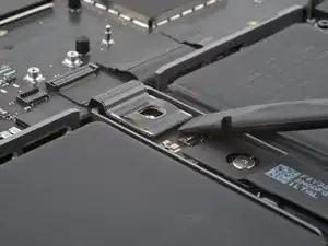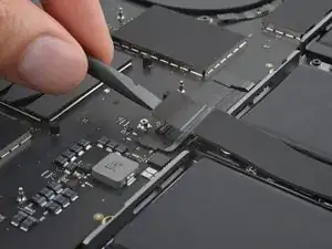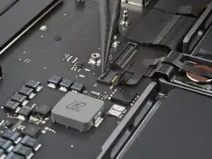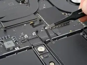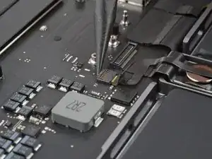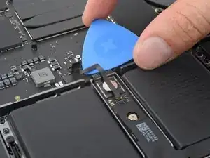 Use the point of your spudger to flip up the small locking flap on the logic board battery data ZIF connector.