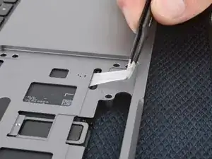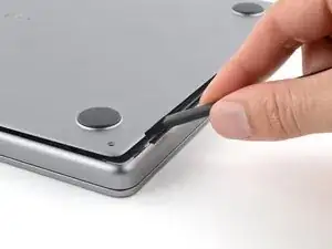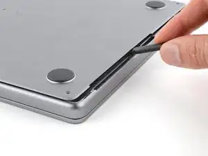 Insert the flat end of a spudger between the lower case and the right screen hinge.