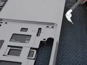 Insert the flat end of your spudger into the front of the cutout in the right side of the frame.