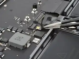 Use your tweezers to grip the neck of the cable and slide it straight out of its socket to disconnect it from the logic board.