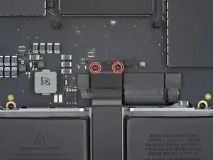 Use a T3 Torx driver to remove the two 2.1 mm-long 3IP Torx Plus screws securing the trackpad connector cover.