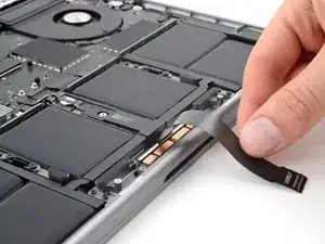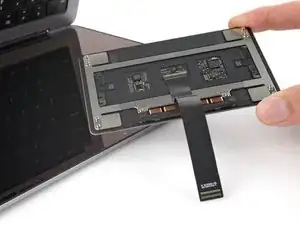 Peel the trackpad cable from the battery board and move it over the front edge of the MacBook.
