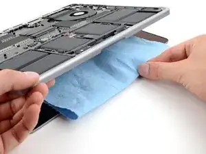 Open your screen and place a paper towel or absorbent cloth between it and the trackpad recess to protect the screen from any residual isopropyl alcohol.