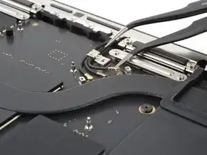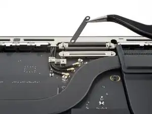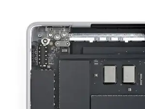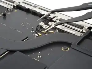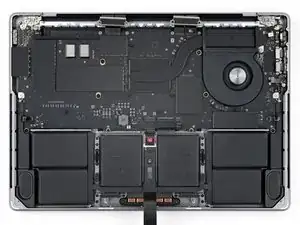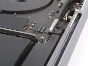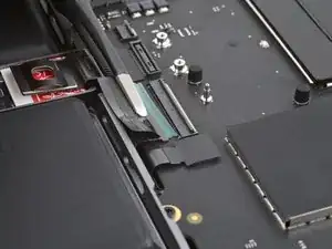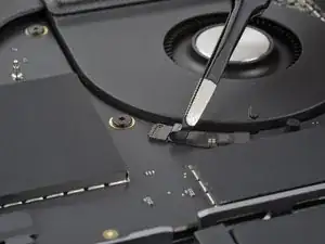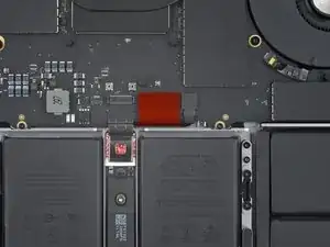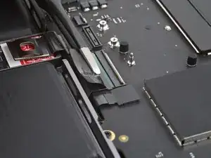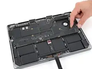 The battery data cable is adhered to the battery board and logic board. In the next few steps, you'll disconnect it, separate its adhesive, and remove it.